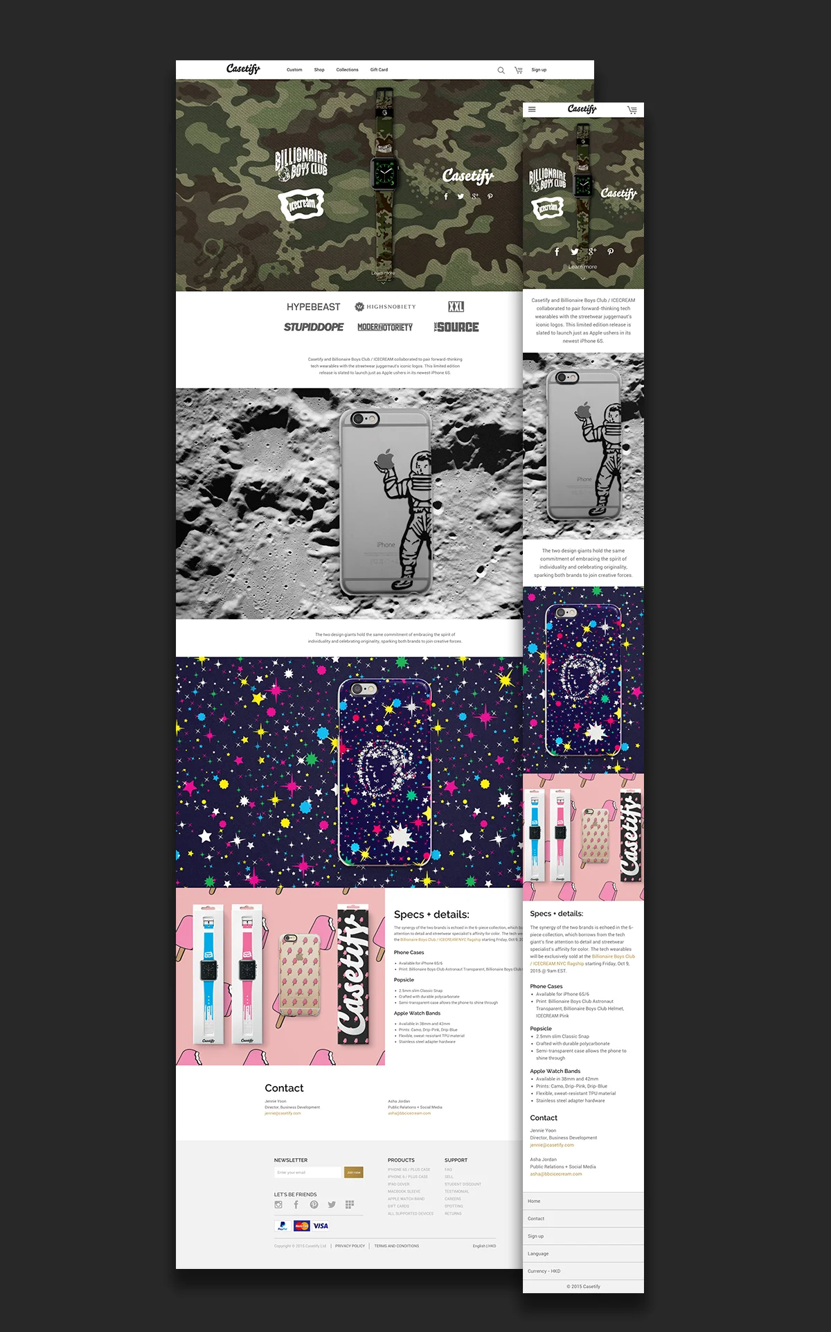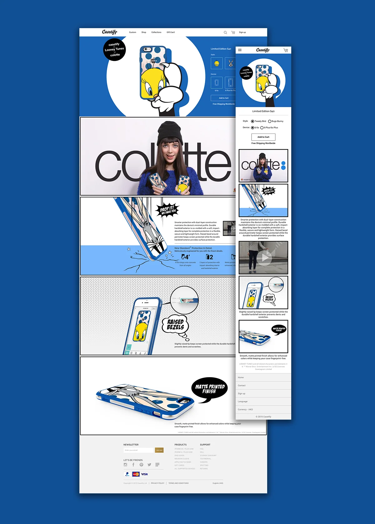 For Casetify's high-profile brand collaborations, I spearheaded the UX/UI design of responsive campaign microsites. Working with developers, I crafted intuitive interfaces that seamlessly adapt to both desktop and mobile platforms, enhancing user engagement and showcasing our co-branded products effectively.