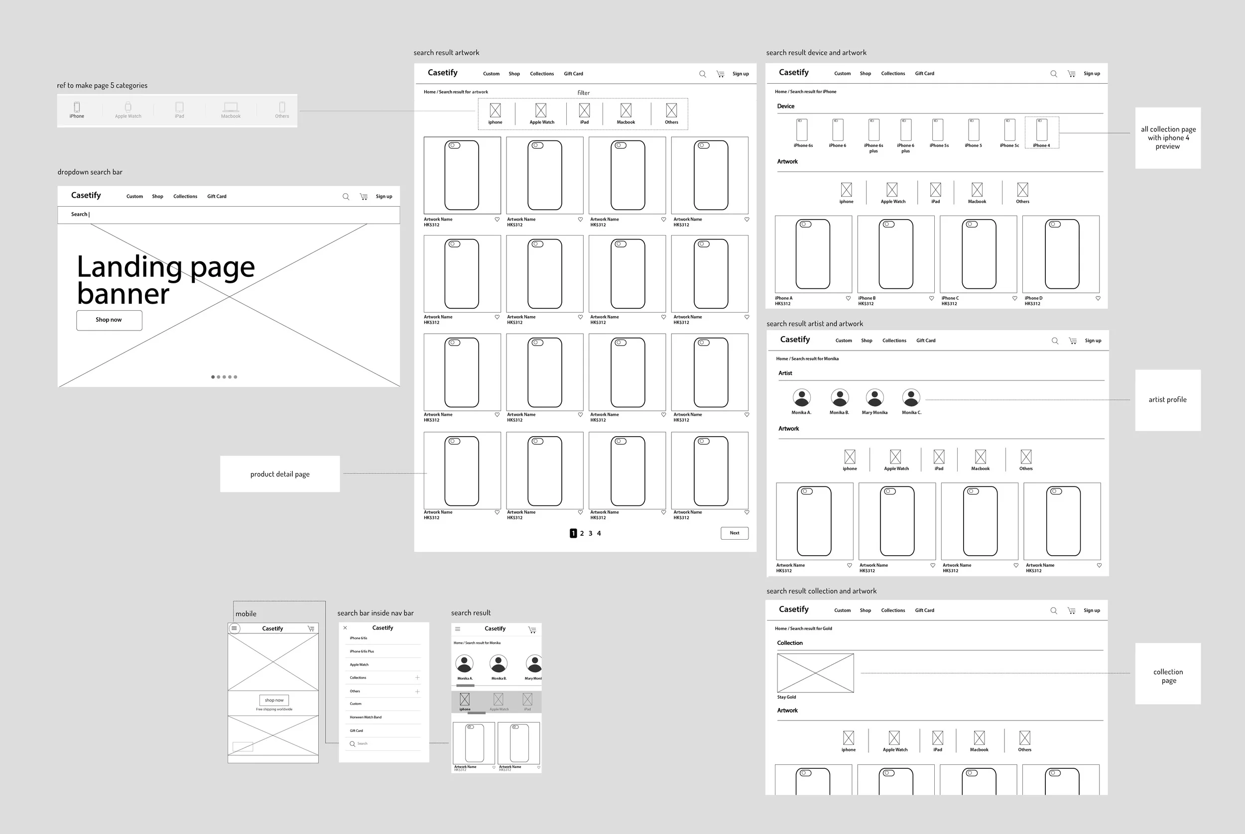 The previous search function was on a separate page, making it difficult for users to return to their previous browsing location. When using the old search function, users could only preview iPhone cases in the search results, which failed to showcase the diversity of Casetify's product range. With Casetify's extensive artwork database, search results often became lengthy, forcing users to scroll excessively to find artists, who were typically listed at the bottom of the page. On mobile devices, users were never able to reach the artist listings in the search results due to this layout issue.